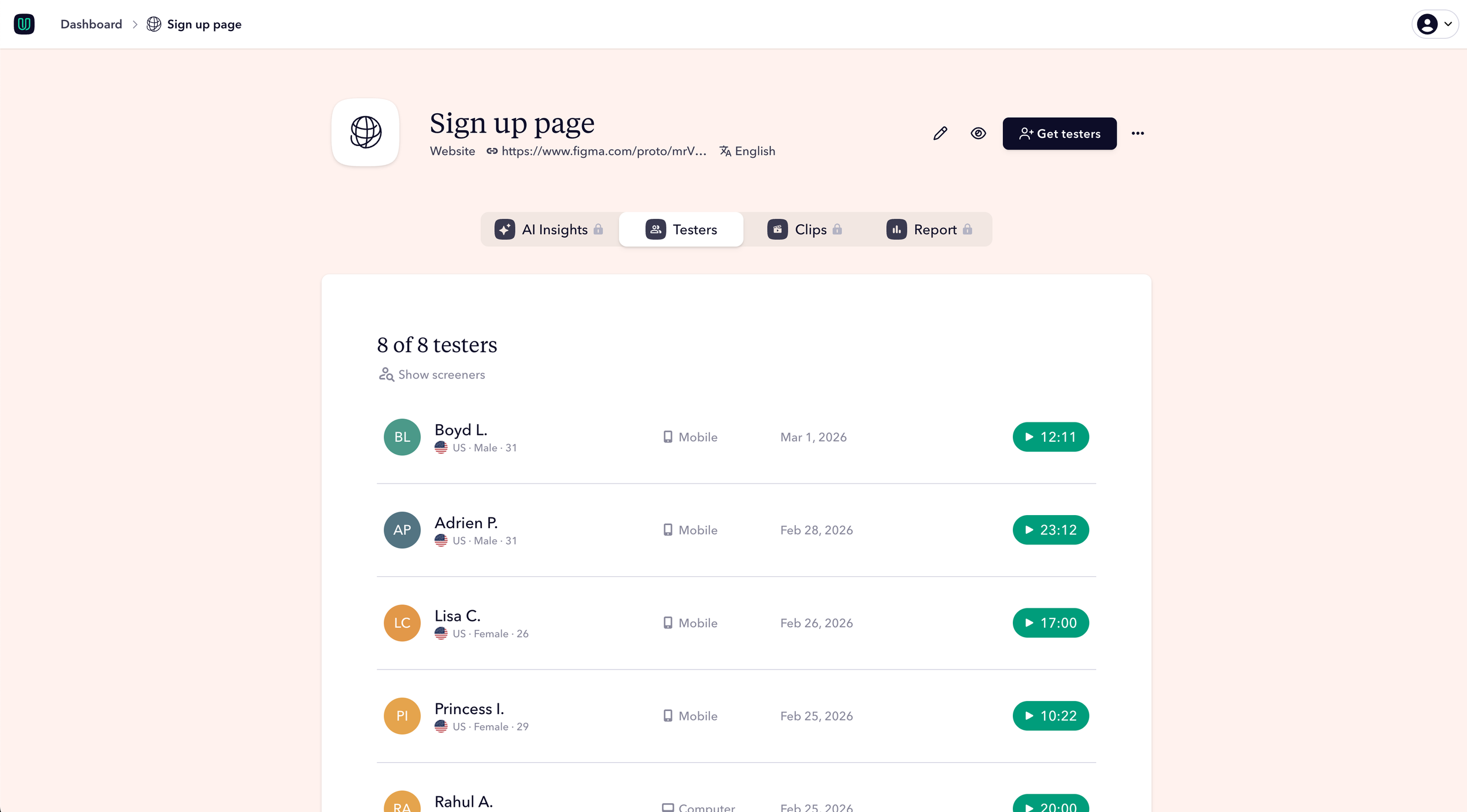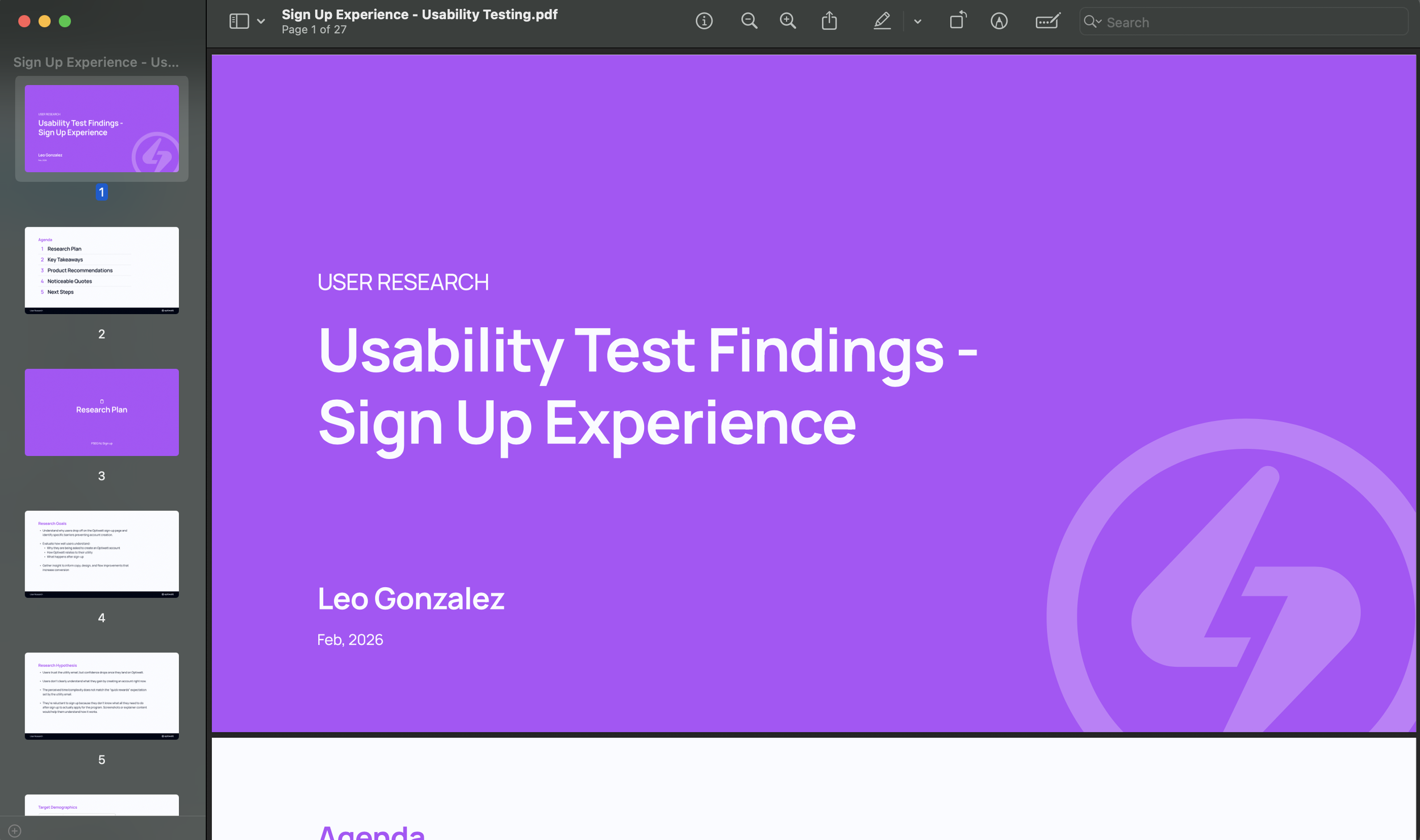 With PostHog data pointing to where users dropped off, I launched an unmoderated usability study through Userbrain to understand why. Participants navigated the full sign-up to enrollment journey on their own, giving us authentic, uninfluenced session recordings to analyze. Userbrain's AI-driven insights automatically surfaced patterns across sessions — dramatically accelerating synthesis and ensuring no critical friction point was missed. The findings fed directly into the research debrief I presented to the full cross-functional team.