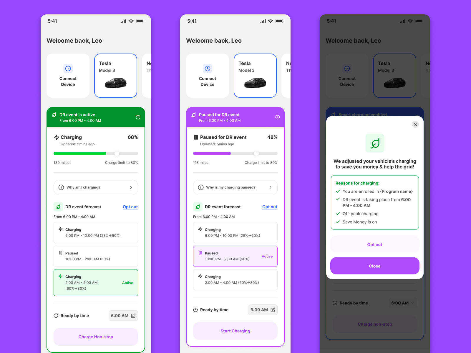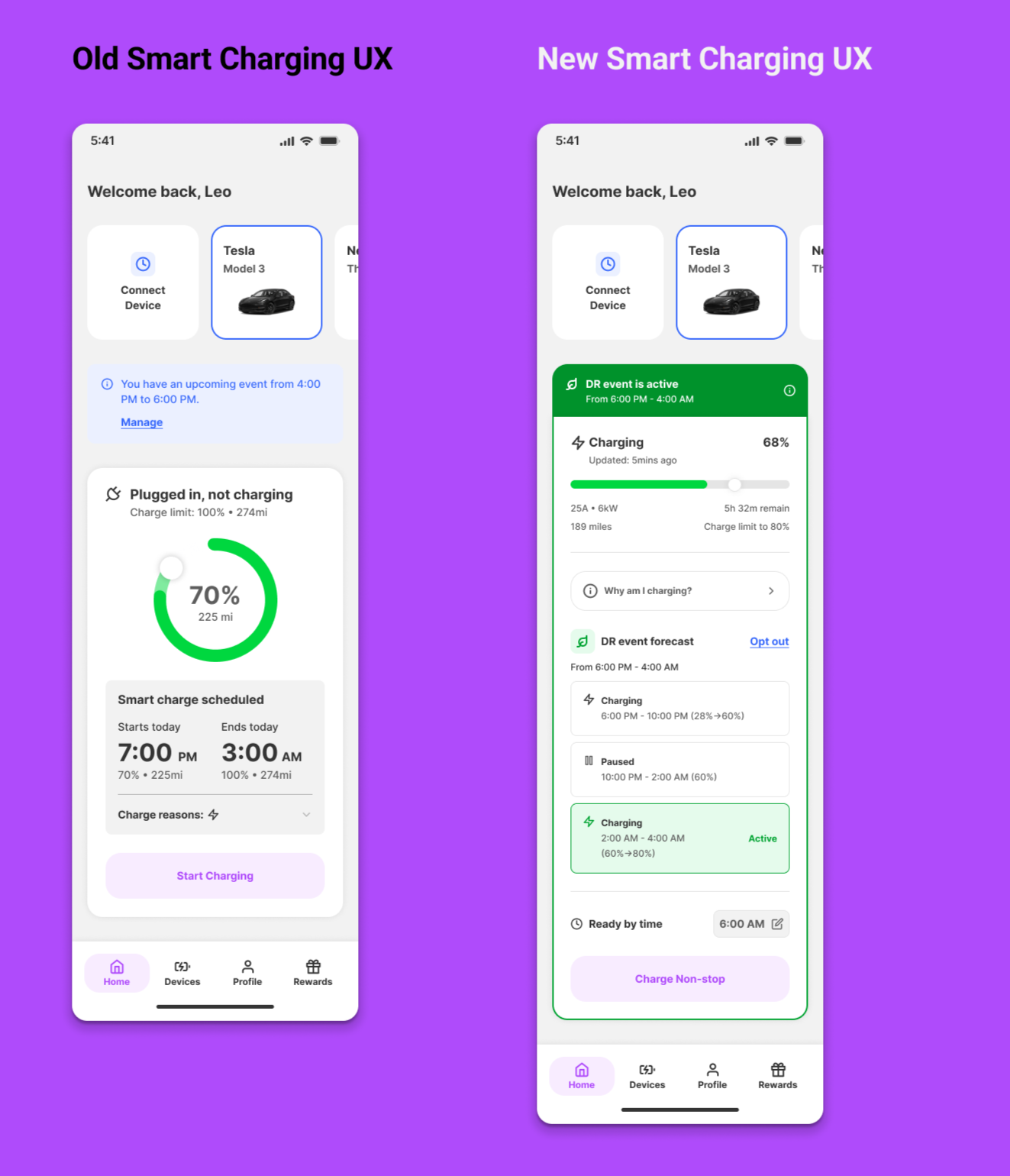 Customer support reports and user research pointed to one core problem — users couldn't tell what Smart Charging was doing, so they turned it off. I redesigned the experience with three targeted fixes: a charging schedule timeline for visibility, a color system for every charging state, and a contextual modal explaining why Smart Charging is acting on their behalf.