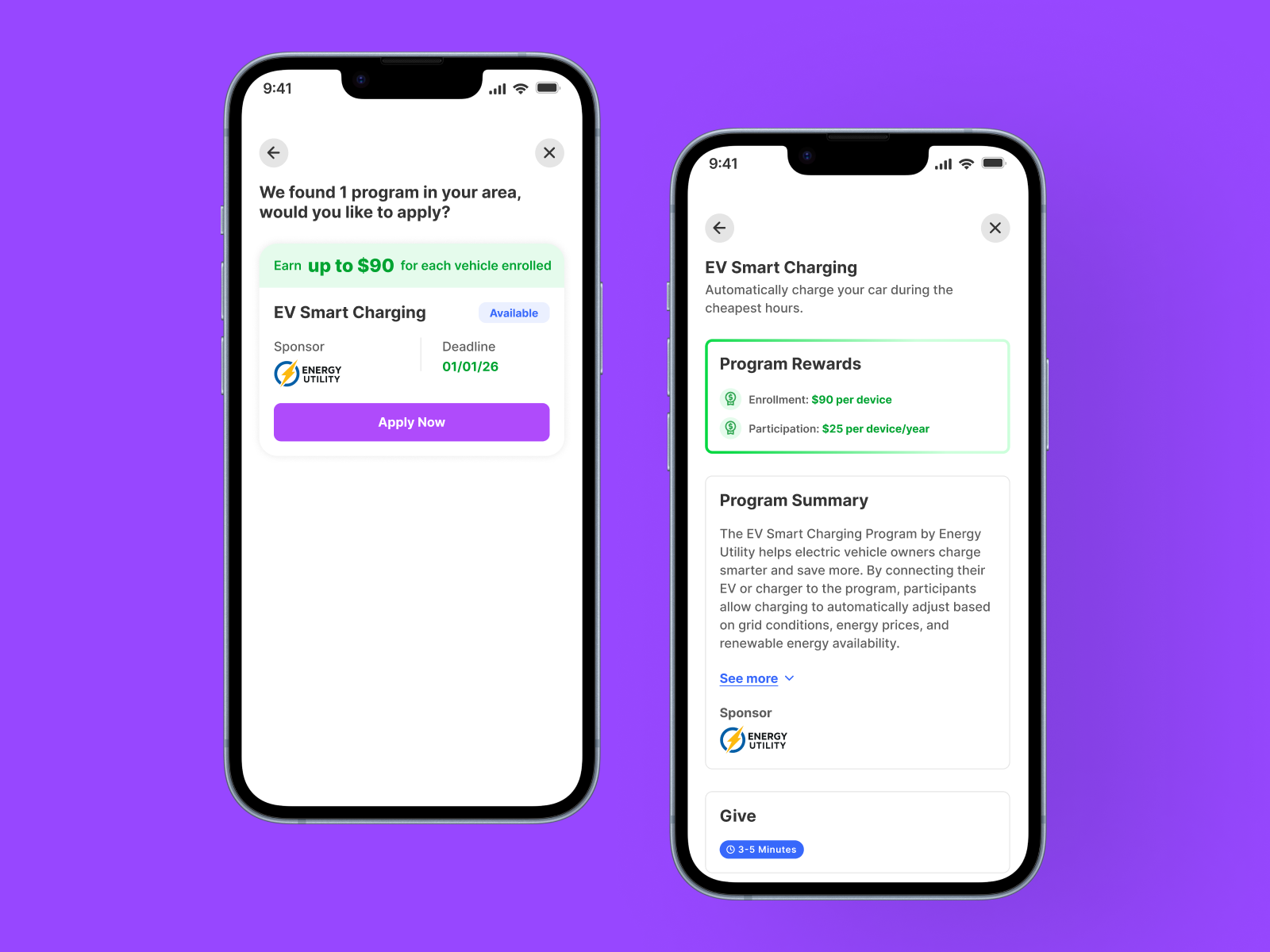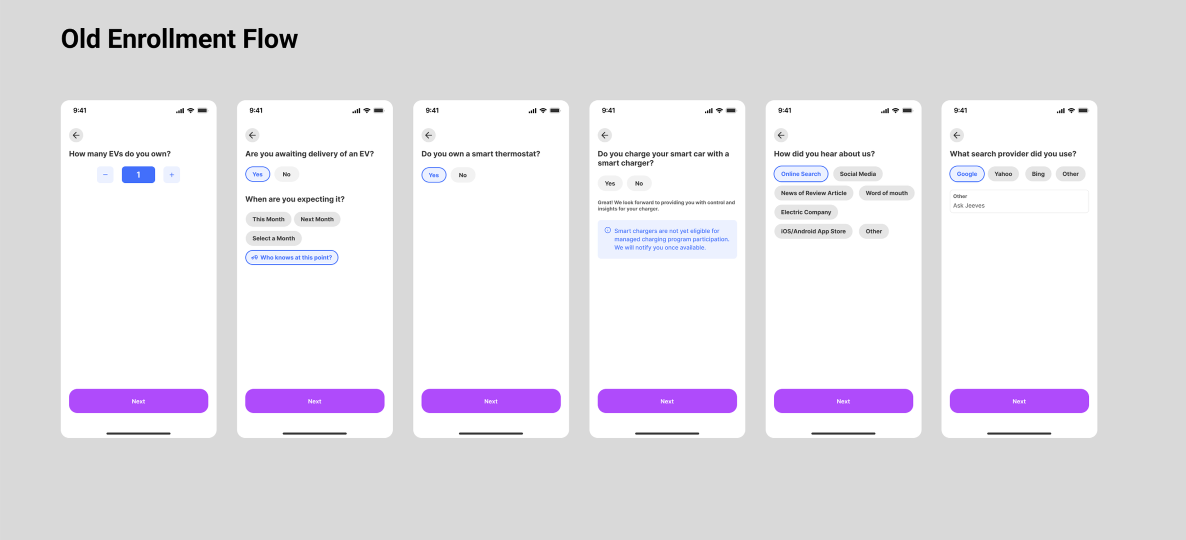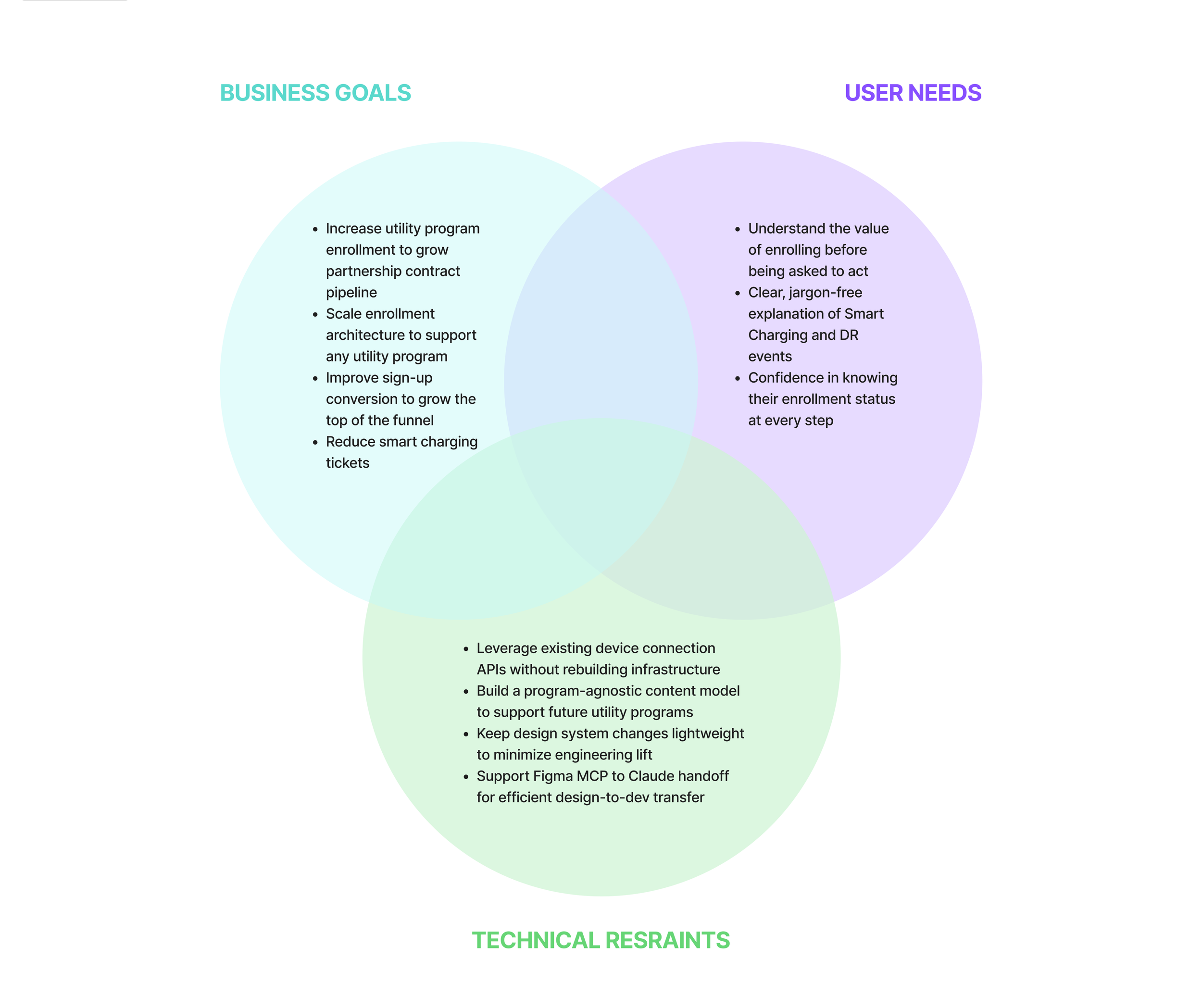 I pushed for discovery before solutions. PostHog told us where users dropped off, research told us why. My core bet: the enrollment flow's device-first framing was the wrong mental model. Users want to save money, not configure a charger. Reframing enrollment around programs and outcomes, not devices, was the strategic pivot. I used UX Pilot for rapid AI-assisted ideation and built a program-agnostic design system to make future utility onboarding a content operation, not a design sprint.