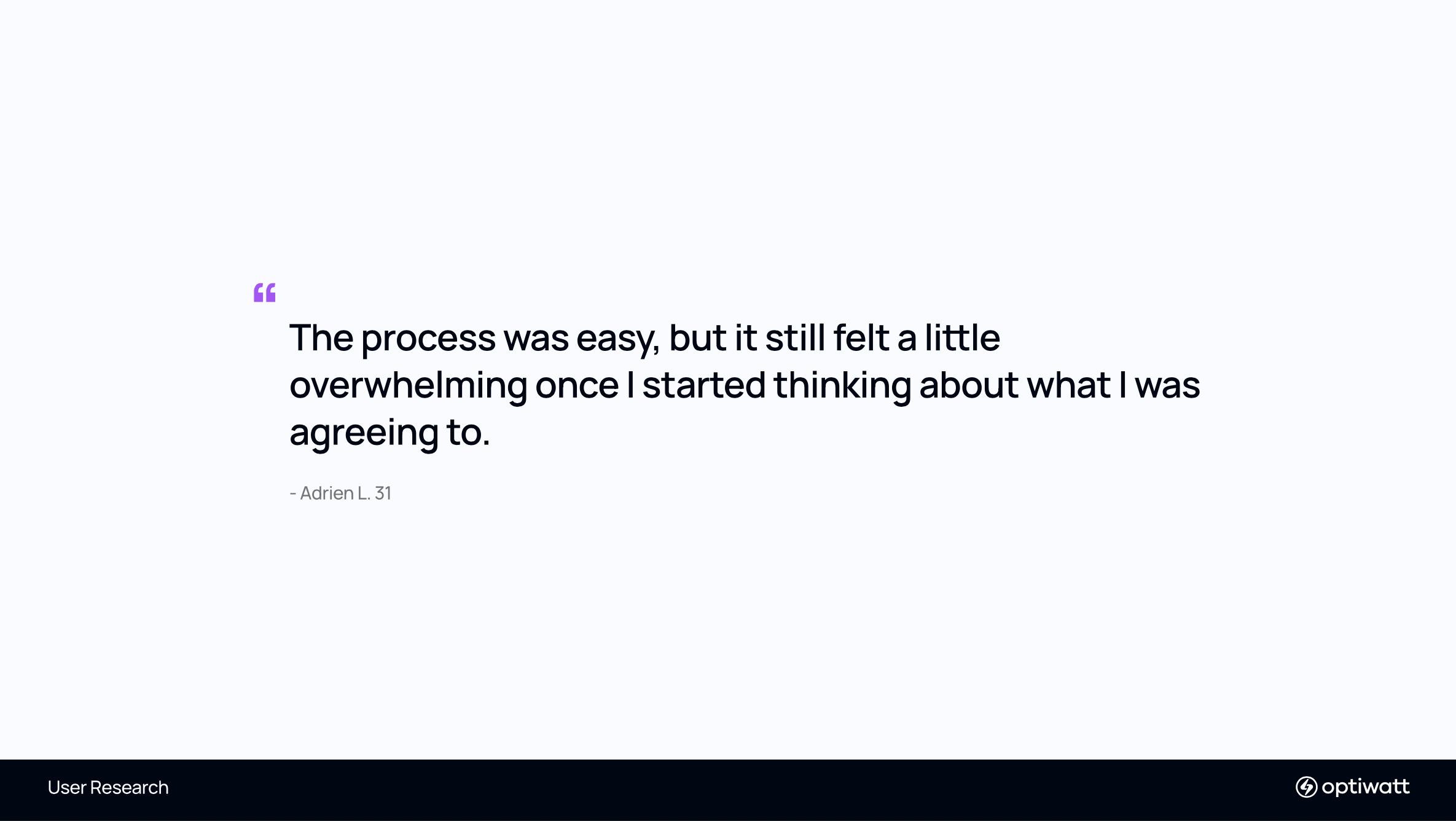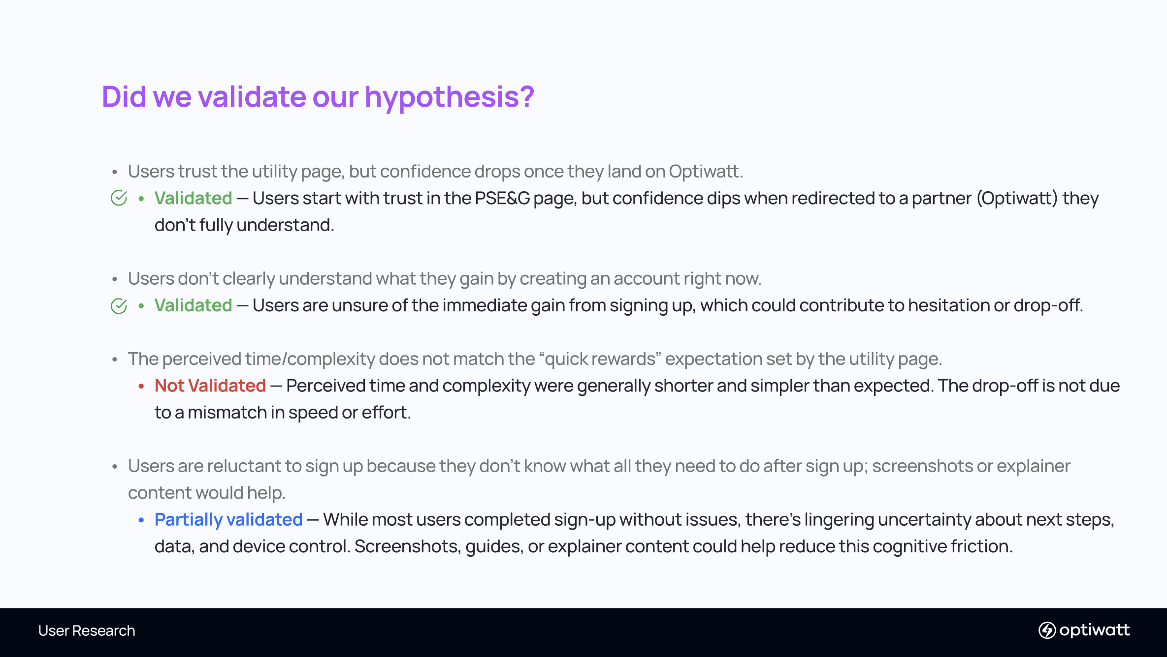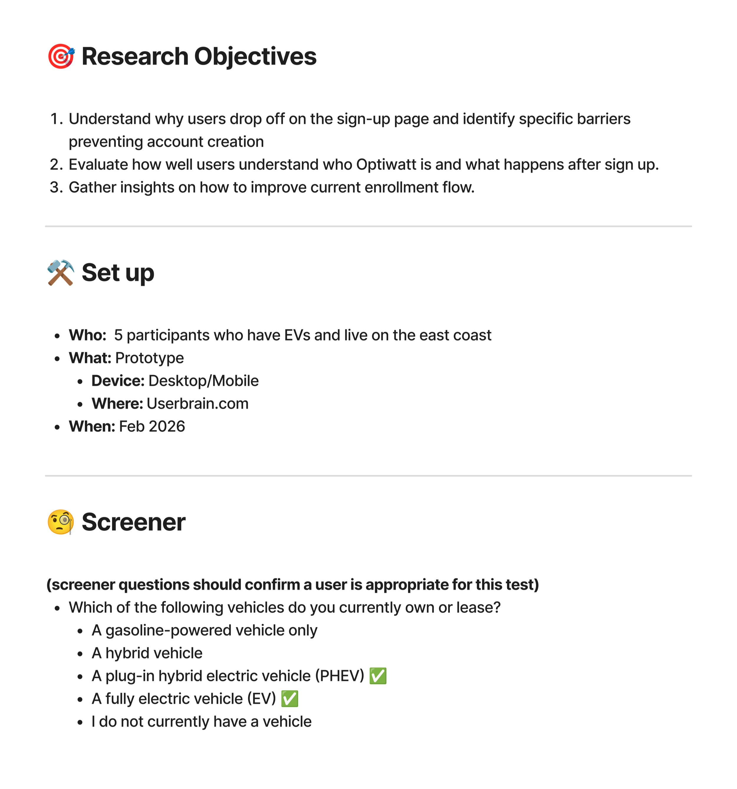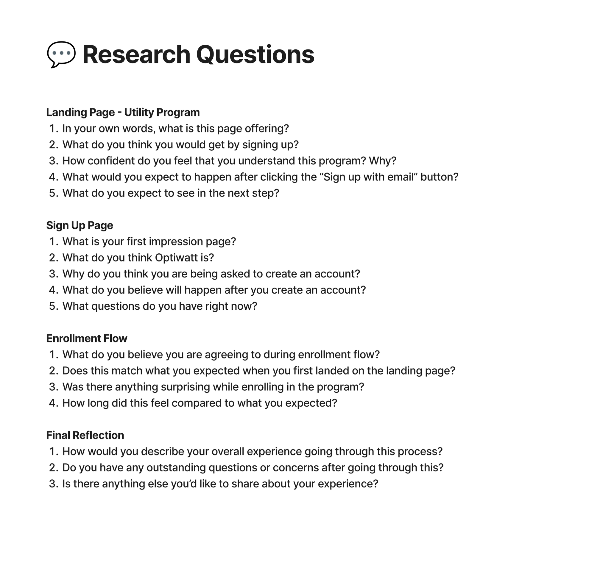 Levering our existing sign up to enrollment flows we decided to conduct unmoderated usability testing to gather information on user expectations and understanding of the entire Optiwatt core experience.