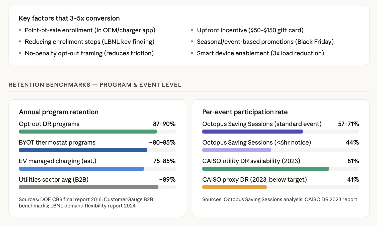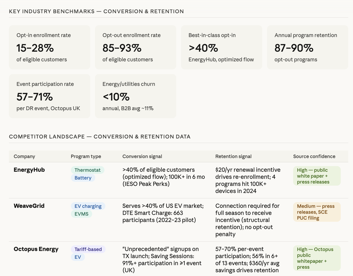 I used AI to synthesize competitor conversion and retention data across the energy tech landscape, benchmarking against EnergyHub, WeaveGrid, and Octopus Energy. The research revealed that best-in-class opt-in enrollment hits >40%, annual program retention reaches 87–90%, and key conversion multipliers include reducing enrollment steps, upfront incentives, and smart device enablement. Optiwatt's 8% enrollment rate had clear room to move — and a clear playbook to learn from.