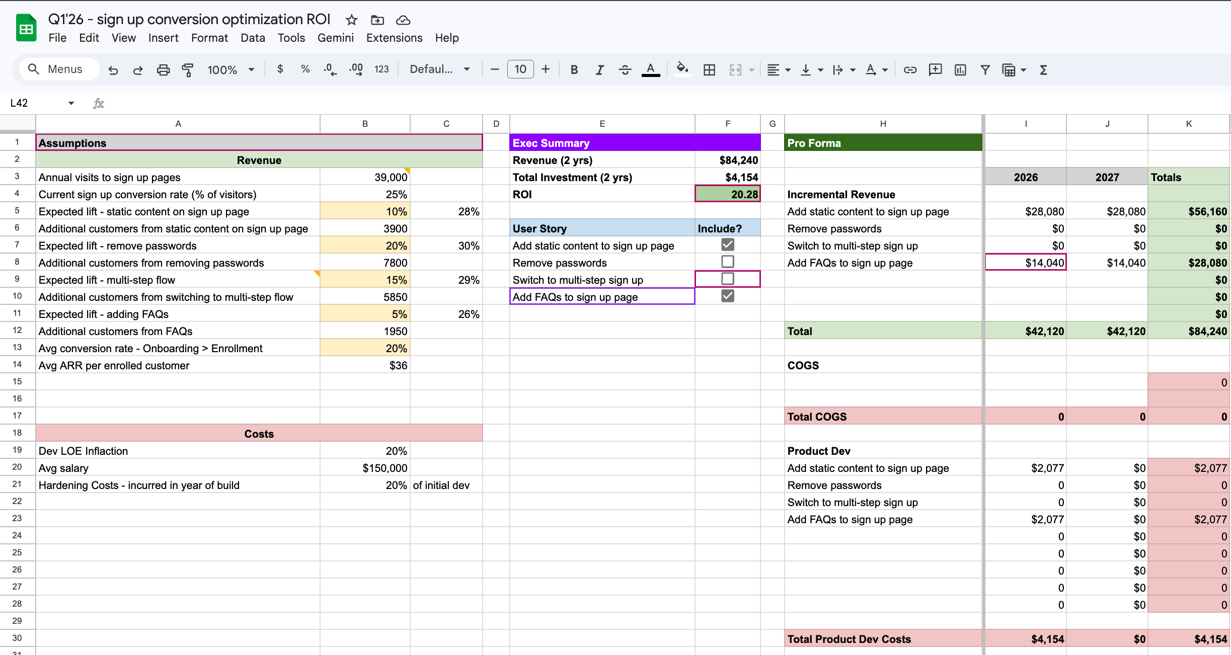The PM and I built an ROI plan to align leadership on the sign-up page investment. Using PostHog data and AI-generated benchmarks, we modeled the revenue impact of improving conversion from 25% to 30%+ — showing that each percentage point directly expanded utility enrollment volume and contract value.