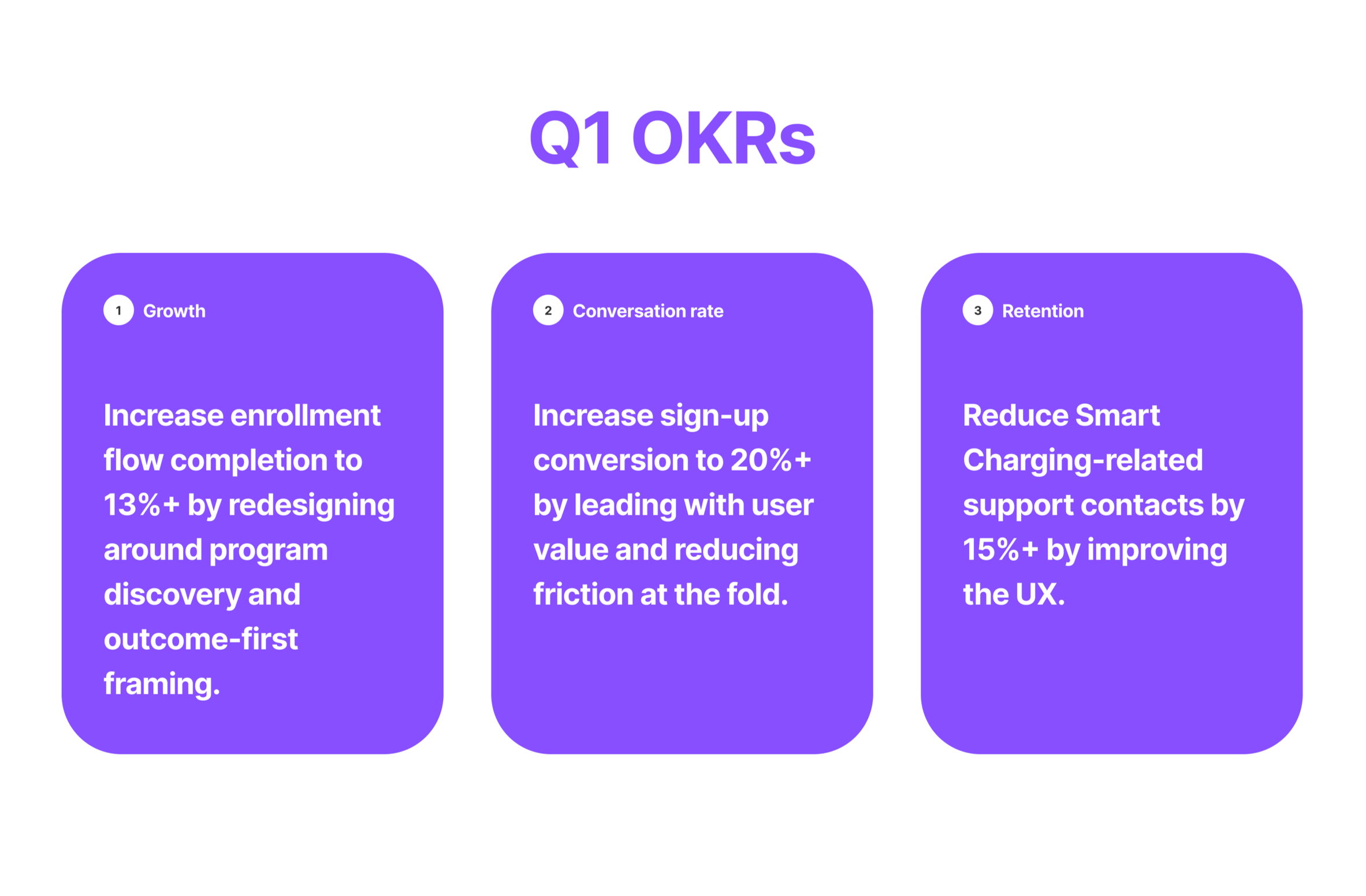 Sign-up conversion sat at 25% and enrollment completion at just 8%, well below industry benchmarks. Meanwhile, Smart Charging, our key retention driver, was generating steady support complaints. Users didn't understand it, so they unenrolled. Left unaddressed, this directly threatened our utility contract pipeline.