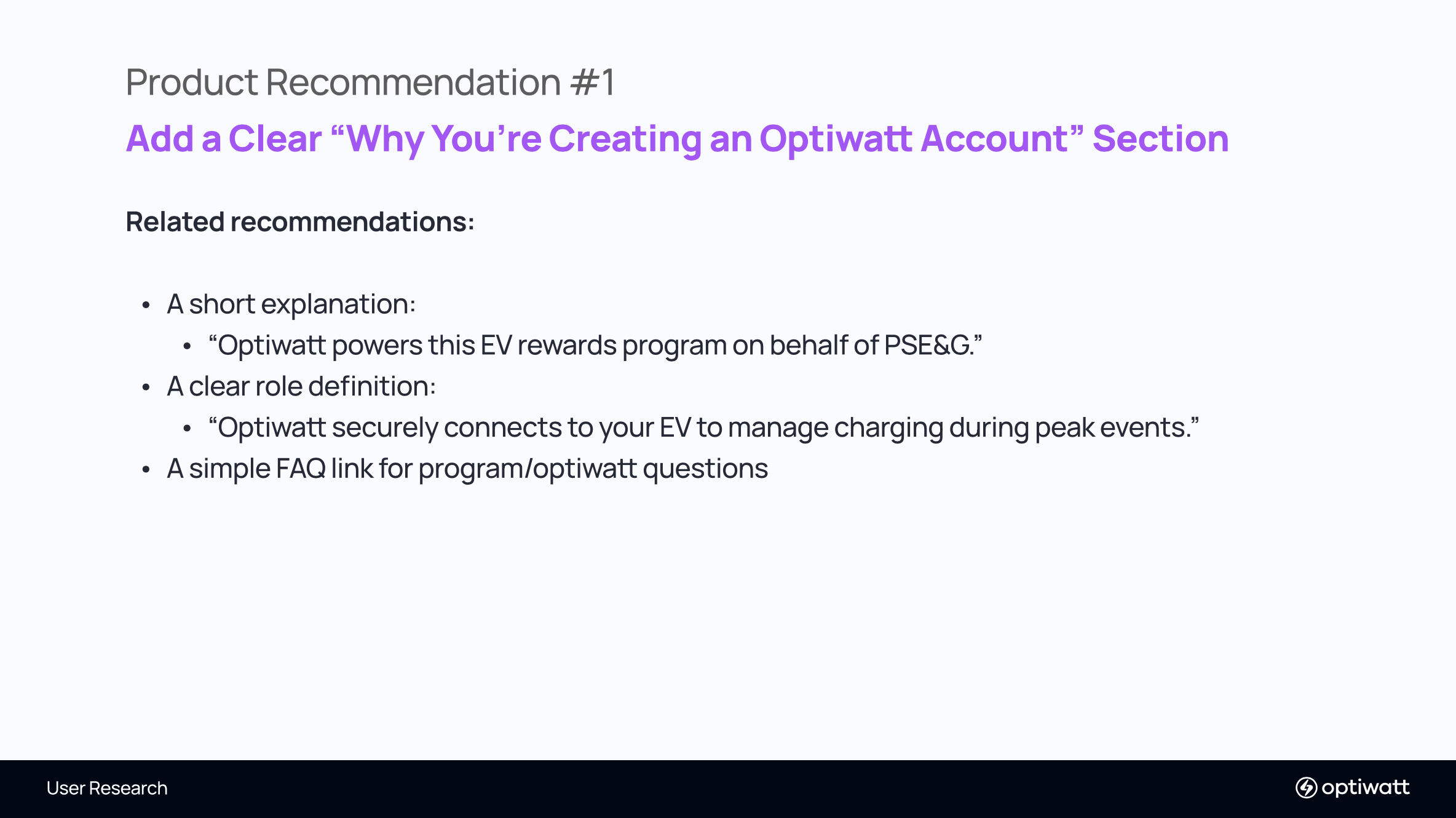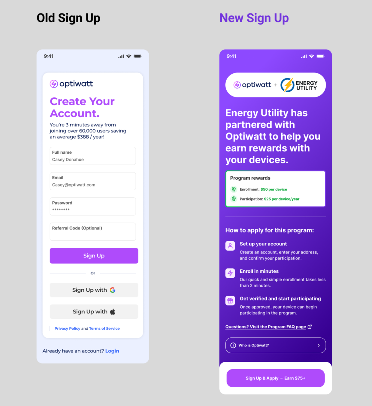 PostHog funnel data and user research made it clear the sign-up page wasn't doing enough to earn the click. I redesigned it to lead with what matters — who Optiwatt is, what programs are available, and what rewards users can earn. A co-branded design builds immediate trust, a simple three-step enrollment overview removes uncertainty, and a fully responsive layout ensures a seamless experience across every device.