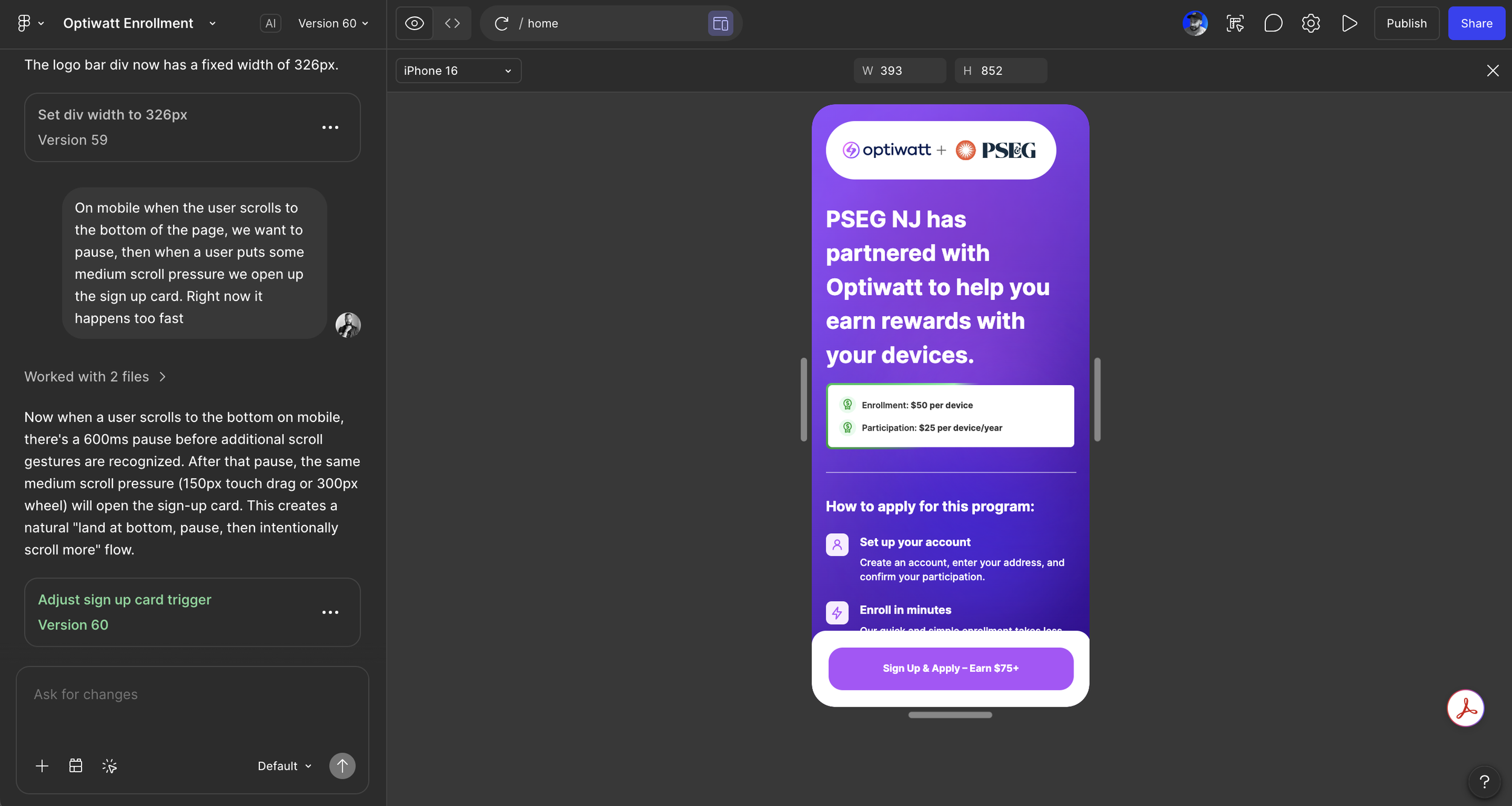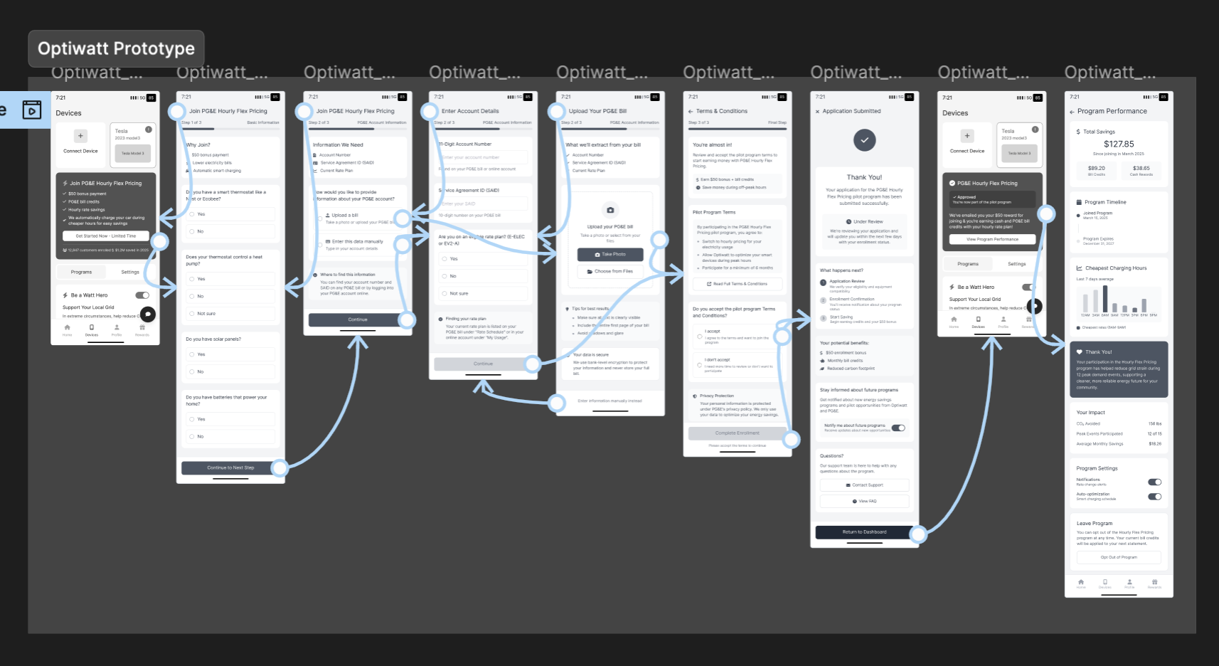 Once designs were finalized, I used Figma Make to build a fully interactive, code-ready prototype of the sign-up page and enrollment flow — giving developers a live, accurate reference rather than static specs. From there, Figma MCP with Claude translated the designs directly into implementation-ready code, eliminating annotation cycles and back-and-forth. The result was a significantly faster build and a handoff process that's now a repeatable standard for how design and engineering ship together at Optiwatt.