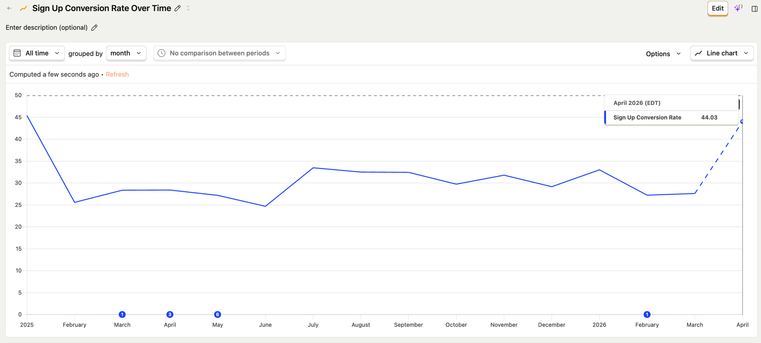 After launch, we returned to PostHog to measure impact against our baseline. The funnel data showed a clear upward trend in sign-up conversion, climbing toward 44% — up from a pre-launch rate of 25% and surpassing the industry best-in-class benchmark of 40%. The data validated the core design bets: leading with value, reducing friction, and co-branding the experience drove meaningful top-of-funnel growth that directly expands our utility enrollment pipeline.