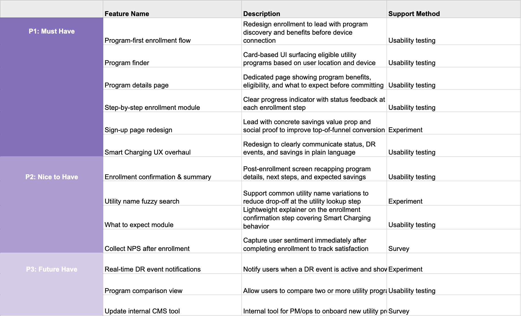 We sequenced work across three streams: sign-up page first (highest leverage, lowest complexity), enrollment restructure second (most strategic), Smart Charging last (retention impact, needs enrolled users to show signal). Anything requiring custom per-program engineering was explicitly deprioritized in favor of the scalable system we were building toward.
